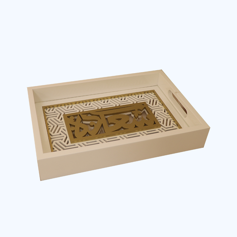 صينية مستطيلة مصنوعة من الخشب الطبيعي بيد جانبية لسهولة حملها لونها أبيض ومحفور داخلها كلمة سعادة باللون الذهبي المميز دلالة على التفاؤل وإدخال السرور نظرا لحضور الضيف في الثقافة المصرية