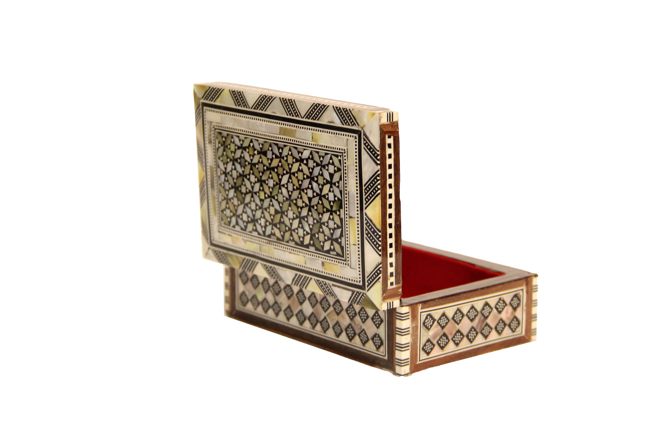 علبة مطعّمة بالصدف مع نقوش شعائرية وتصميم متليت، مثالية للهدايا أو الزينة.