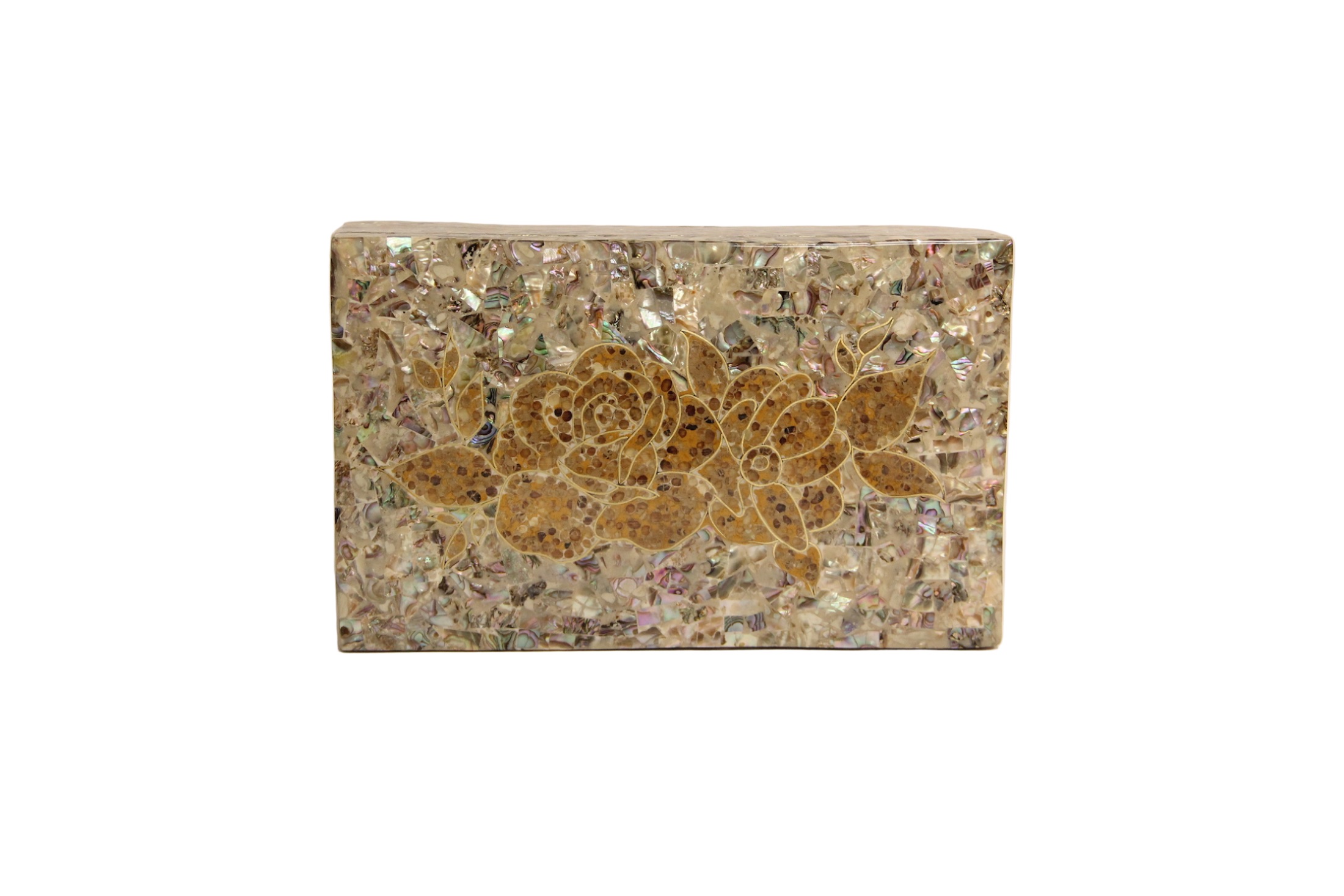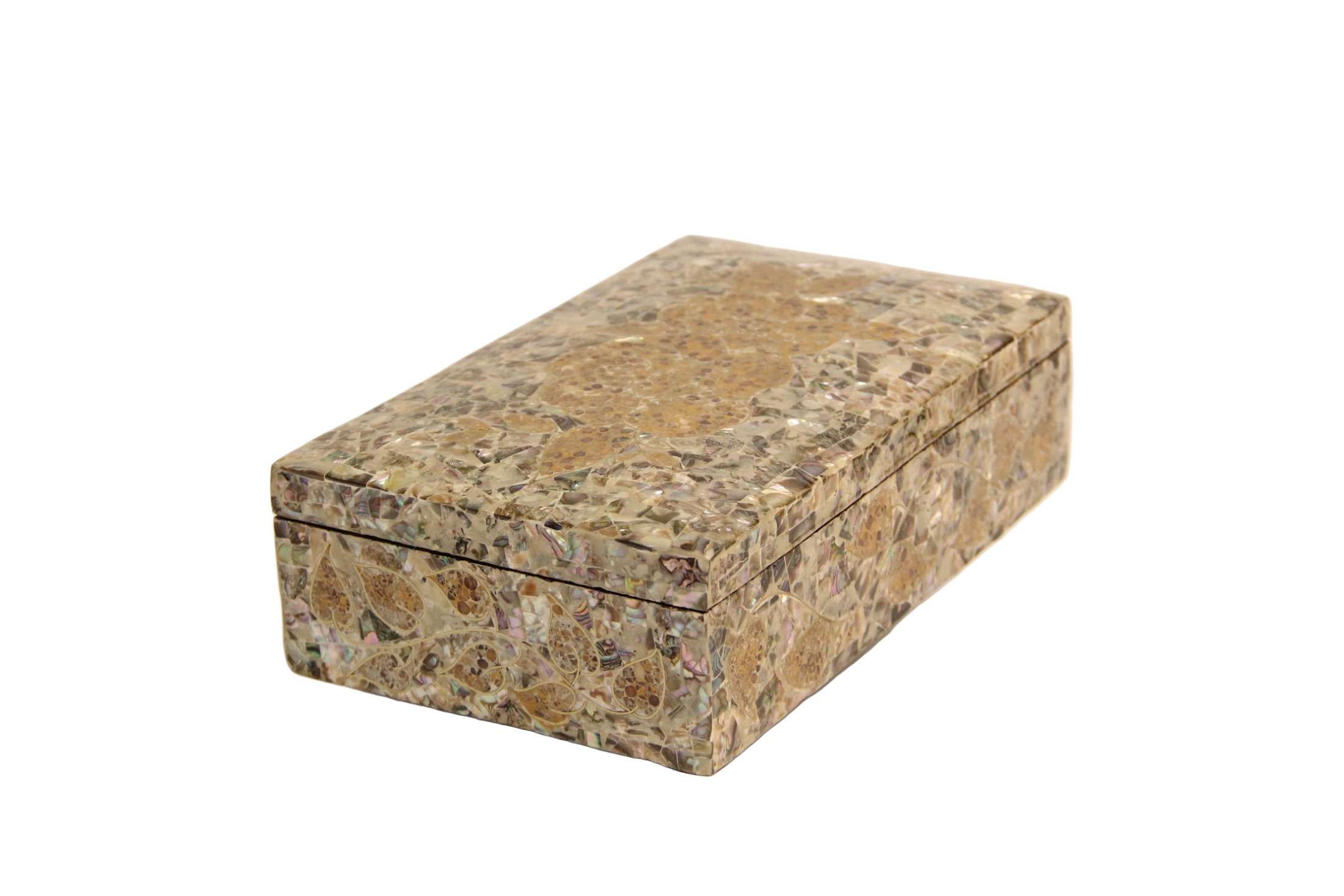 علبة مطعّمة بالصدف مع ألوان زاهية ولمسات كهرمان، تصميم جذاب وفخم.