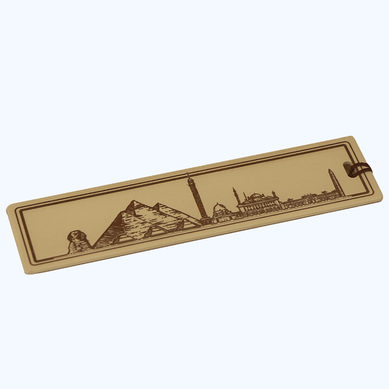 فاصل كتاب خشبي بيج مستطيل منحوت عليه باللون البني أشكال تعبر عن معالم مصر الحضارية القديمة والحديثة ( الأهرام – أبو الهول – القلعة – برج القاهرة )