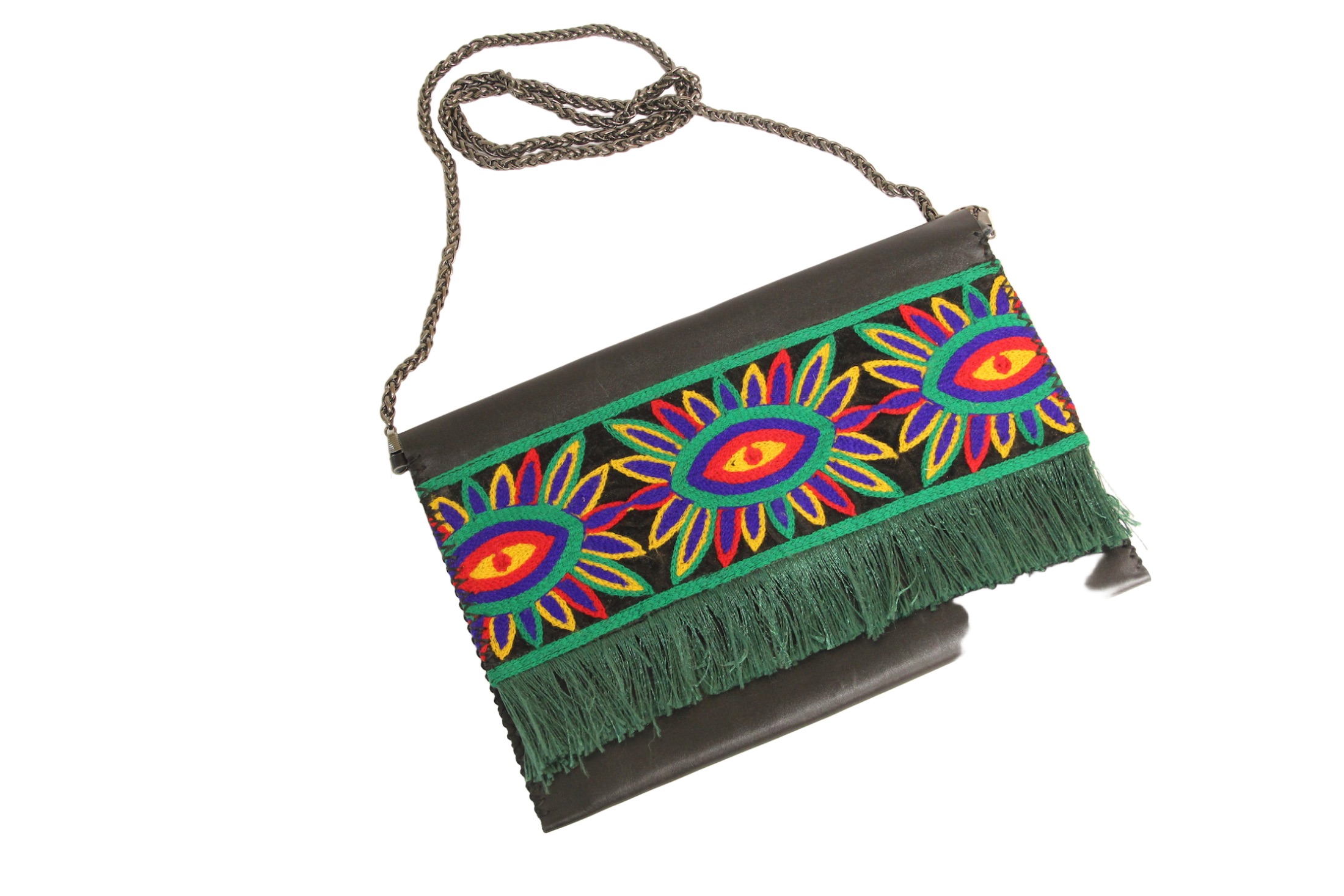 كلاتش جلد طبيعي حريمي أسود مطرز بالتطريز اليدوي والخيوط ذات الألوان المبهجة وبه حبل من الممكن تعليقه عالكتف