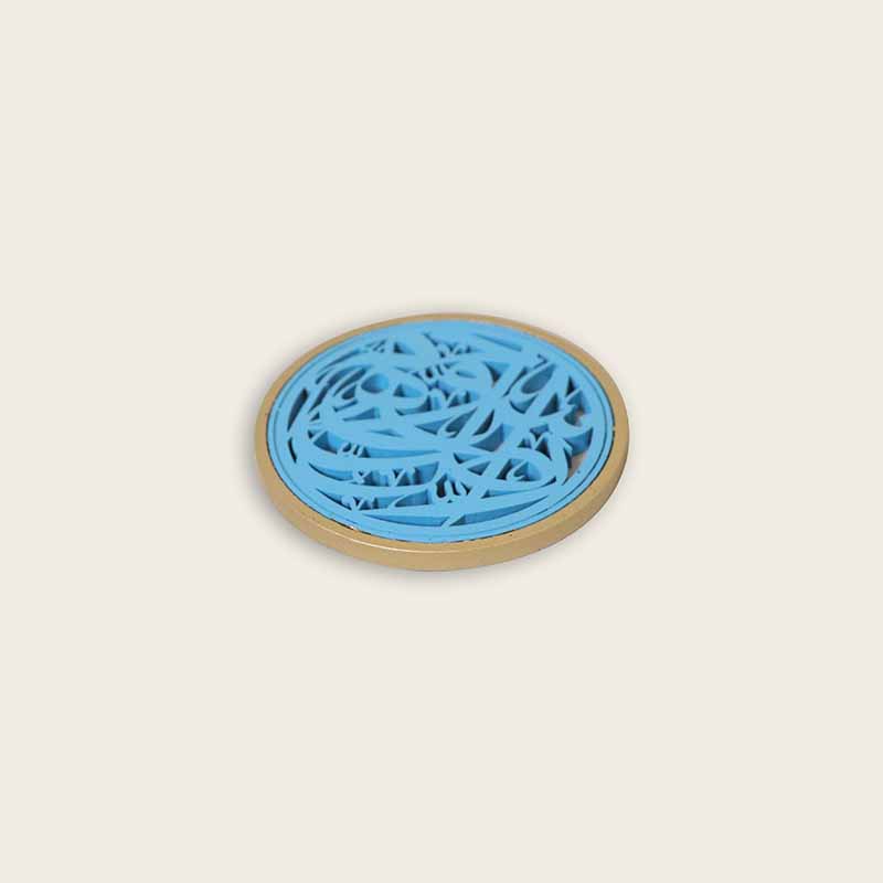 حامل كوب خشبي دائري أزرق ومحاط بإطار باللون الذهبي مصنوع من الخشب الطبيعى تم حفره بتصميم مستوحى من الطراز الإسلامي المميز الموجود على جدران وشرفات المساجد والمنازل في مصر الإسلامية تم حفر بعض حرو ف اللغة العربية بداخله