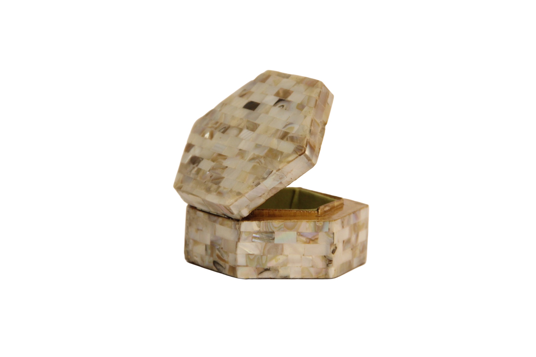 علبة خشبية مسدسة مطعمة بمربعات صدف محار، تصميم فني أنيق لتخزين المقتنيات الصغيرة.